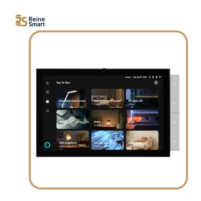 شاشة مركزية بتصميم أنيق وتقنية متطورة، تتيح لك التحكم الكامل في الإضاءة، الستائر، والنظام الصوتي بكل سهولة.