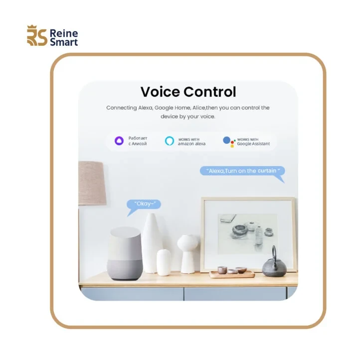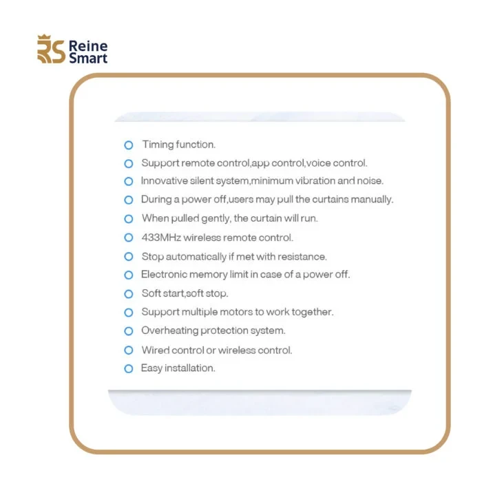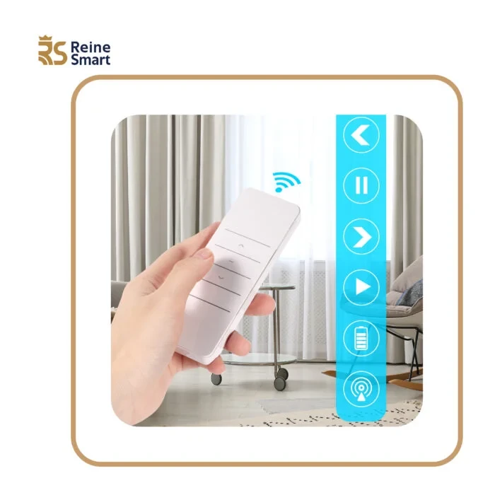 ستائر Reine Smart الذكية بمقاسات متعددة مزودة بموتور تحكم ذكي يدعم التحكم عن بعد، مع إمكانية إنشاء سيناريوهات يومية لفتح وإغلاق الستائر تلقائيًا حسب أوقاتك المفضلة. تجربة تجمع بين الراحة، الأناقة، والتكنولوجيا الحديثة.