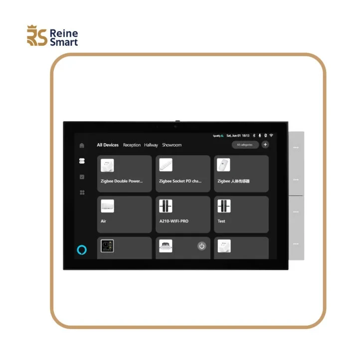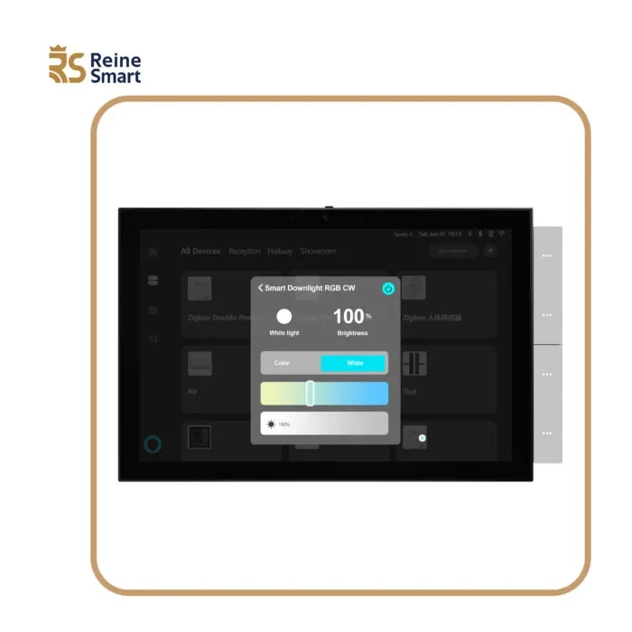 شاشة مركزية بتصميم أنيق وتقنية متطورة، تتيح لك التحكم الكامل في الإضاءة، الستائر، والنظام الصوتي بكل سهولة.